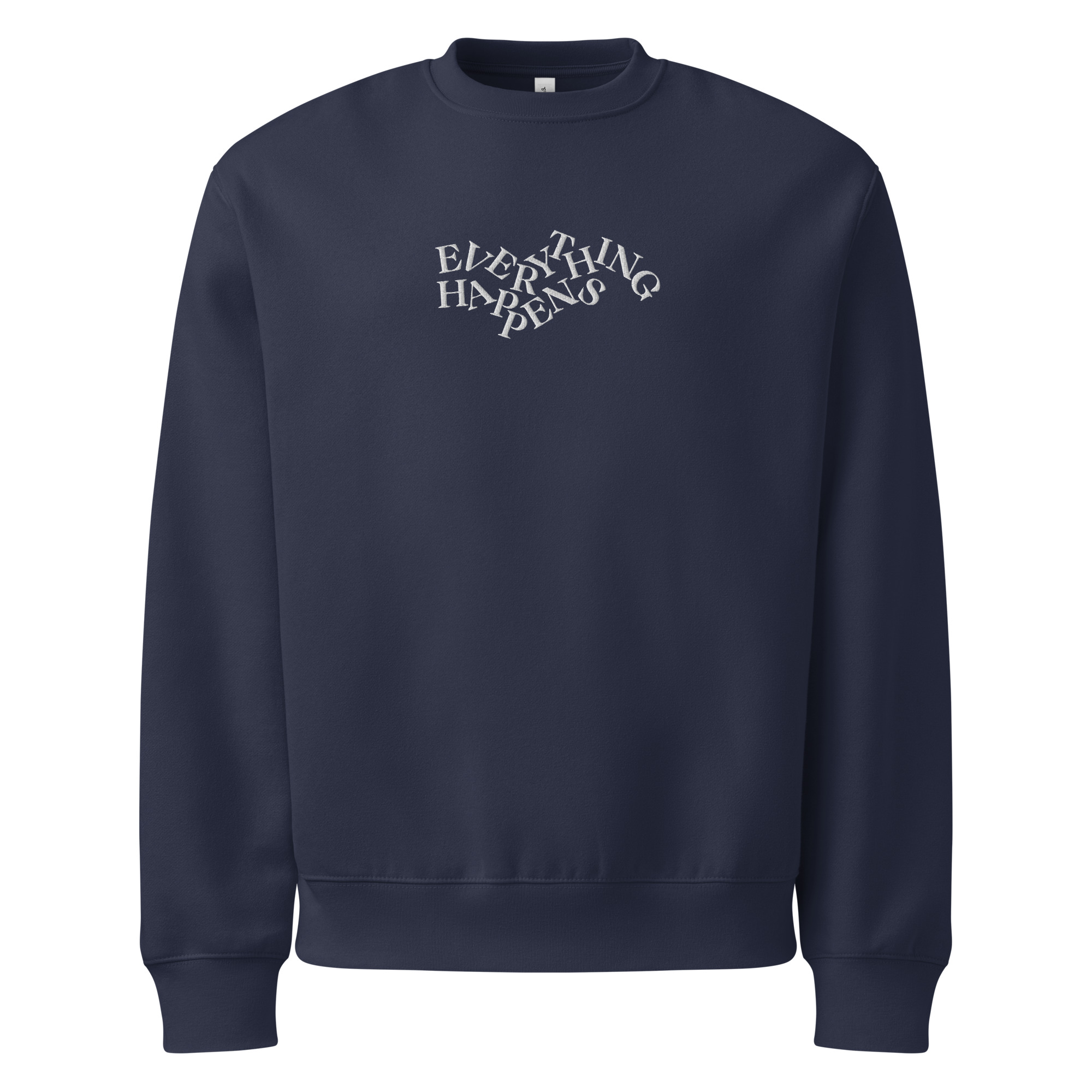 This navy crewneck is embroidered with our signature “Everything Happens” design—crooked and true, just like life. It’s soft like hope and oversized for the days when your feelings take up more room than usual.